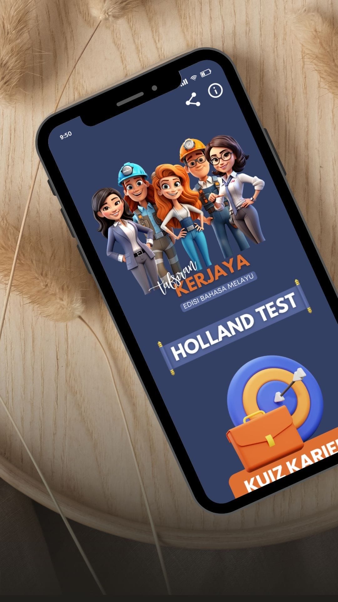 Aplikasi ini menyediakan ujian lengkap untuk pengguna mengenalpasti kerjaya yang sesuai dengan diri mereka. Setiap tafsiran kerjaya dimaklumkan secara terperinci di akhir ujian.