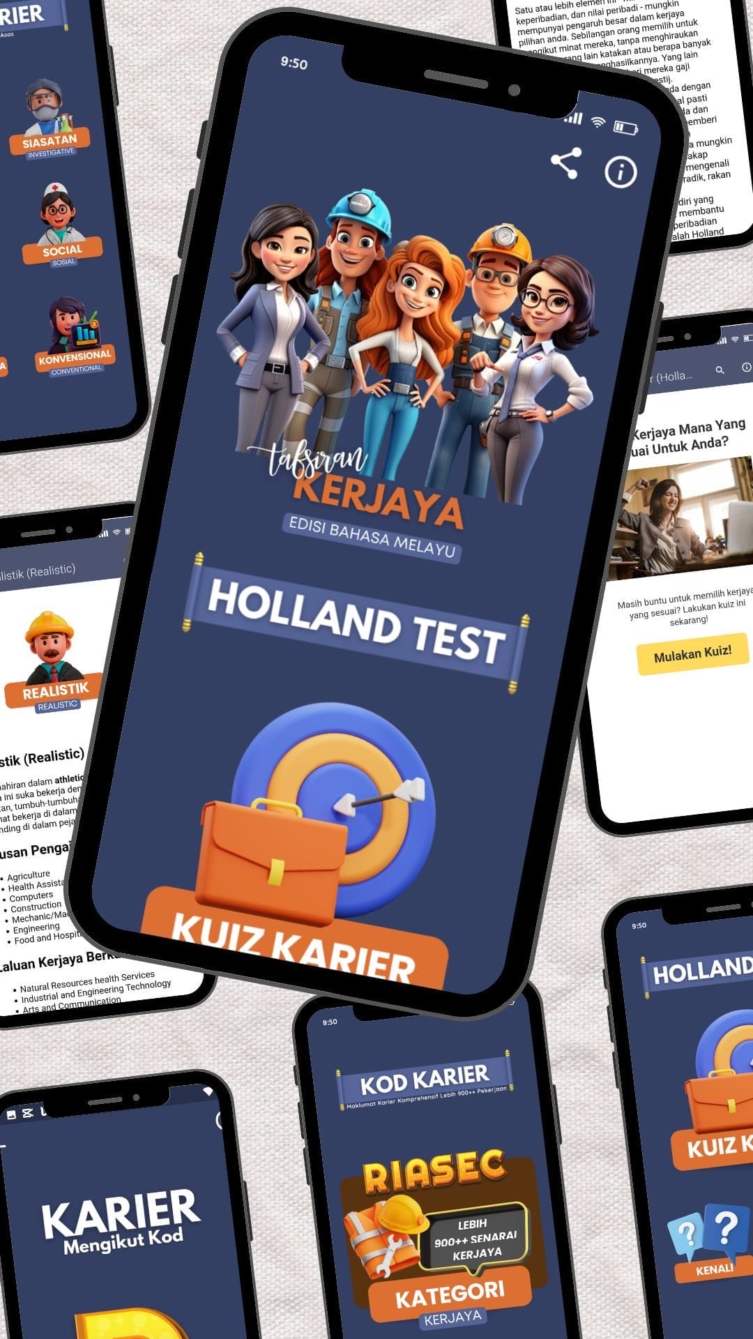 Menurut Holland (1973), tingkah laku vokasional adalah berkaitan dengan interaksi antara enam jenis personaliti iaitu Realistik (R), Investigative (I), Artistic (A), Social (S), Enterprising (E), Conventional (C). Oleh itu, untuk memudahkan anda, aplikasi ini dibina untuk membantu anda mengenal pasti kerjaya yang sesuai dengan personaliti anda.